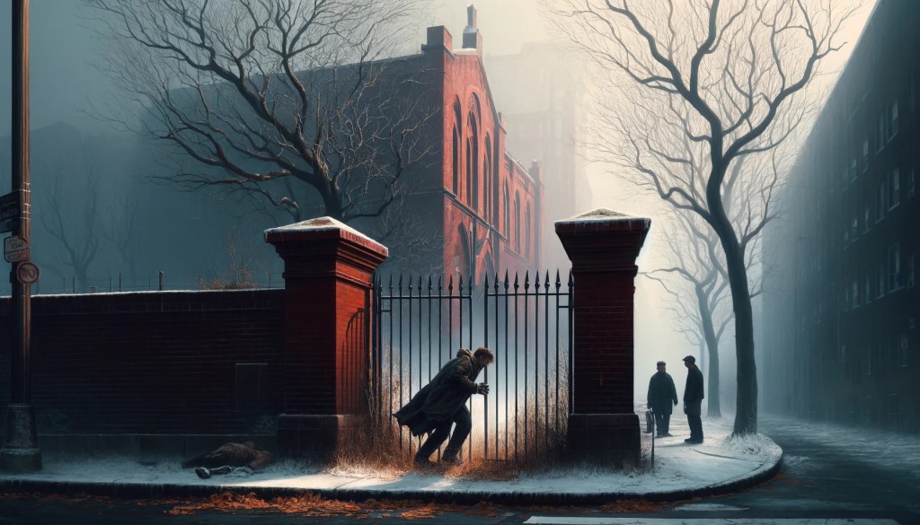On the other side of the street, a vacant lot lay where winter had left the trees skeletal and ghostly. Despite the clear day, a halo of fog hung over everything, and a cold light illuminated the bare branches. At the top of the street, an old, solid, and imposing red brick wall loomed.
