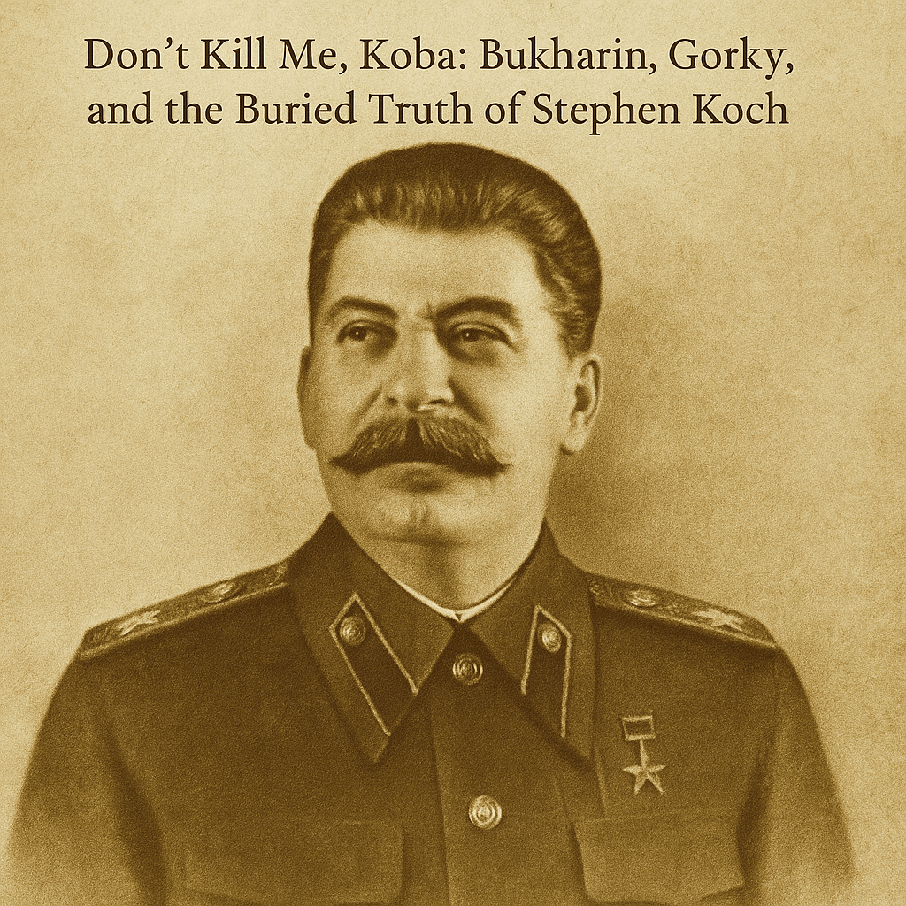 Don’t Kill Me, Koba is a literary and historical reflection on the tragic returns of Bukharin and Gorky to Stalin’s Soviet Union—and the forgotten American author who told their story with unmatched clarity: Stephen Koch. Why was he erased? Why was his work plundered? This essay connects erased martyrs with silenced writers, revealing the machinery of curated forgetting in both totalitarian regimes and modern cultural institutions.