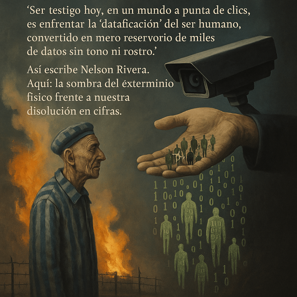 Today I understood, with a clarity that only spiritual maturity can offer, the meaning of original sin and the necessity of a savior. I understood why we are broken. Why goodwill and good ideas are not enough. I understood why Auschwitz did not end in 1945. Because its logic has mutated, and today it operates in subtler forms: the infrastructure of camps is no longer needed to perpetrate oblivion. It’s enough for a file to be deleted, a right denied, a story silenced. I understood this as I read Nelson Rivera’s passages where Auschwitz is not a place of the past but a language of the present: “the alphabet of the camp,” he writes, “has no commerce with life.” That alphabet—that apparatus of symbolic annihilation—bears an uncanny resemblance to the administrative language of our time: files, databases, algorithms. If yesterday arms were tattooed, today codes are assigned. If once we were destroyed by fire, now we are erased with clicks. I understood this not through drama, but through the moral precision of testimony. I understood that to be a witness today also means resisting this new form of disappearance: the digitalized, disposable soul. I understood that memory is not an intellectual pastime, but a moral obligation.