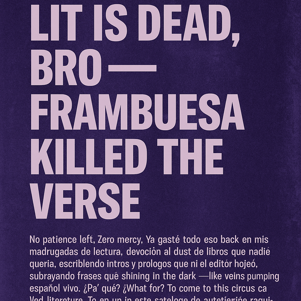 No patience left. Zero mercy. Ya gasté todo eso back en mis madrugadas de lectura, devoción al dust de libros que nadie quería, escribiendo intros y prólogos que ni el editor hojeó, subrayando frases que shining in the dark —like veins pumping español vivo. ¿Pa’ qué? ¿What for? To come to this circus called literatura. To end up in este catálogo de autoficción raquítica, thrillers overhormonados, poetitas que escriben como si Alexa fuera su ghostwriter.
